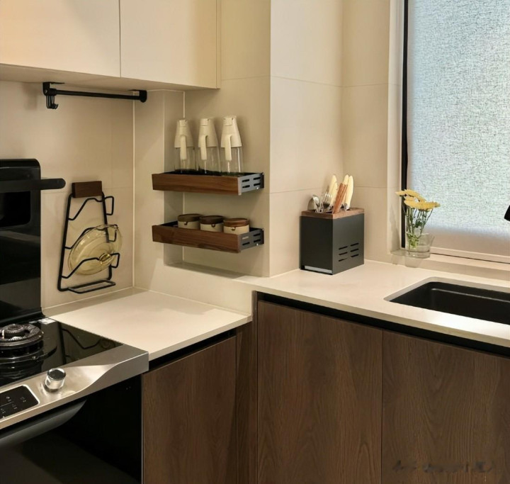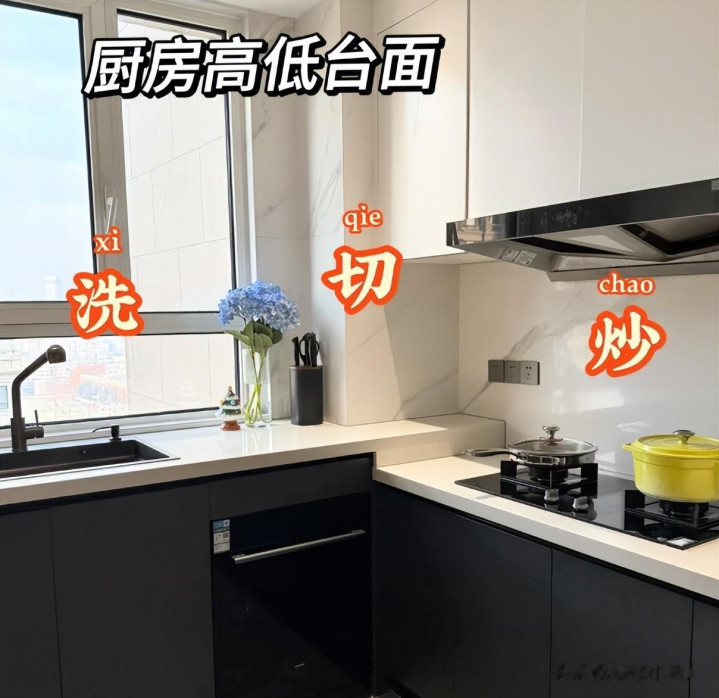 当初我还不理解,等到入住使用后发现,这样设计简直太爽了。有了高低差后,你炒菜不累、清洁不累,每天下厨都轻松了很多。