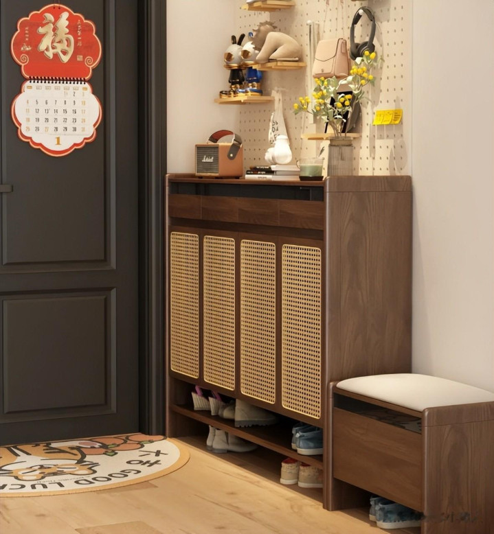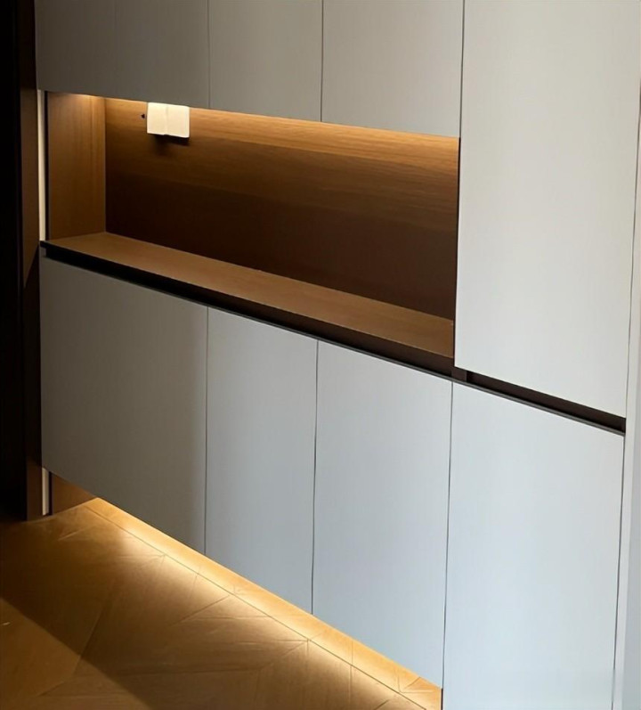 灯光是直接固定鞋柜上,在装修前提前预留好线路,后期装玄关柜把感应灯固定上就行了。